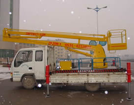 一種利用汽車引擎動力驅(qū)動的折臂式高空作業(yè)車。車輛的行走功能,使升降平臺有更好的靈活性和機動性,使高空作業(yè)效率更高。折臂結(jié)構(gòu)緊湊,采用新型型鋼,強度高,重量輕,架設速度快,工作臺既可升高又可水平延伸,還可旋轉(zhuǎn)360度,易于跨越障礙到達工作位置。