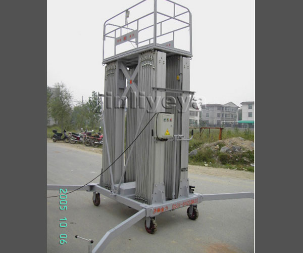 *Adopting hydraulic and chain intermodal transportation. *The synchronous lifting and lowering of the three sets of masts and columns support the working platform, which has working stability. *Beautiful appearance, small size, light weight, flexible and convenient movement, safe and reliable lifting and lowering operations. *Foldable guardrail, when idle, the guardrail can be folded down to reduce its own height, saving space, and easy to install during operation. *The lifting operation is equipped with two sets of buttons, which can be controlled both on the workbench and under the workbench. *The frame is formed by welding rectangular tubes. *The lifting column is made of high-strength aluminum alloy profiles, with a compact structure and double chain traction, providing a high safety factor. *The platform has a limited limit when it rises to a high position.   Note: Can be designed and manufactured according to user requirements Applicable locations: Aluminum alloy aerial work platforms are suitable for repairing, maintaining, and cleaning shopping malls, hotels, restaurants, indoor decoration, layout, space lighting lines, pipelines, doors and windows, and are also suitable for working in spaces with narrow areas or spaces. Aluminum alloy aerial work platforms are suitable for repairing, maintaining, and cleaning shopping malls, hotels, restaurants, indoor decoration, layout, space lighting lines, pipelines, doors and windows, and are also suitable for working in spaces with narrow areas or spaces. 1、 Operation usage 1. Before starting work, open the support arm to 135 ° (see figure), rotate the leg screw cylinder, adjust the base to horizontal, fasten the safety rope, check whether the travel switch is firm and sensitive, and whether the upper control button is normal. Then, you can operate the platform to lift and lower. When lifting to the working height, the staff must wear a safety belt and lock it on their body and a sturdy object. 2. Lifting operation: It is divided into up and down control lifting and flashlight dual-use. Operate according to the marked symbols. Before use, check whether the manual pressure valve is closed. When there is a sudden power outage during operation, the manual pressure pump valve can be released, and the elevator slowly descends to the position. 3. During elevator operation, the diameter of the power cord should not be less than 4 square millimeters and the length should not exceed 20 meters. 4. Do not drop items into the slide during homework. 5. Overloading operations are not allowed. 6. The elevator is not allowed to move the entire machine until it has been lowered to its designated position. 7. Outdoor work is prohibited in rainy weather. 2、 Attention: 1. When disassembling and assembling the elevator, the body should be vertical to prevent deformation and oil leakage of the main body. 2. Staff should pay attention to the tools and components they carry with them and avoid falling into the support frame to prevent the chain from getting stuck. 3. Before using the machine, first empty it once and carefully observe whether there are any abnormal sounds in various parts. Once discovered, it should be stopped from use; After being debugged by maintenance personnel, it can be used (with a three-month warranty for electrical components). 3、 Daily maintenance and upkeep: This machine is an indoor unit and should be used on a hard ground to avoid overturning when used outdoors. The chain screws and safety rope screws should be adjusted every 20 uses, and the electrical and hydraulic systems should be repaired by personnel. Our factory is spacious and bright, with excellent production equipment and imported production line equipment, Our leading products include over ten series, including high-altitude work platforms, hydraulic lifts, lifting platforms, boarding bridges, electric flatbed trucks, hedge trimmers, railway bridges, and car lifts. Jinli adopts a flexible production system to meet customers' special requirements for the design and production of lifting platforms. In the design and production departments of Jinli, we are able to quickly provide solutions for a series of special requirements raised by customers. Our products have been successfully applied in many industries such as aerospace, aviation, nuclear power, logistics, pharmaceuticals, railways, chemicals, and automobiles.