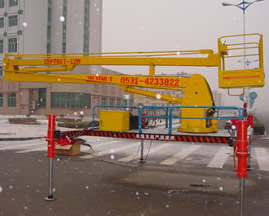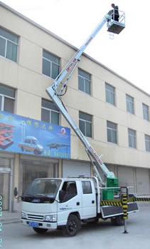 一種利用汽車引擎動力驅(qū)動的折臂式高空作業(yè)車。車輛的行走功能,使升降平臺有更好的靈活性和機動性,使高空作業(yè)效率更高。折臂結(jié)構(gòu)緊湊,采用新型型鋼,強度高,重量輕,架設速度快,工作臺既可升高又可水平延伸,還可旋轉(zhuǎn)360度,易于跨越障礙到達工作位置。